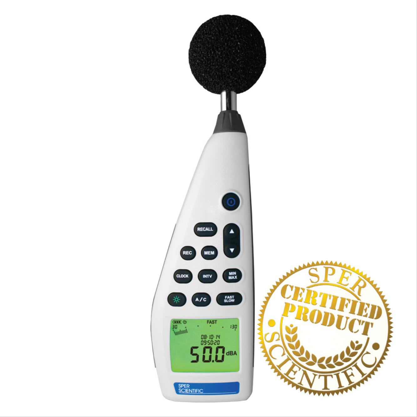 A single dynamic 30 to 130 dB range. Eliminates the need to manually select ranges and prevents data errors during range changes in auto-ranging models. All test parameters are simultaneously displayed on a large, bright backlit display, featuring 0.1 dB resolution and a bar graph. Automatically log up to 31,000 records for later download, or manually save and recall 99 data points with date and time stamp directly on the meter s LCD. The bidirectional USB port and software also enable control of the meter via its on-screen image. Accurate within +/-1.4 dB, and meets or exceeds all other specs for an ANSI S1.4 and IEC 61672-1 Type 2 meter. Also features A/C and fast/slow weighting scales, min/max, over/ under alarms, AC or DC recorder output and auto power off. Calibrate in compliance with OSHA using Acoustical Calibrator 850016. Comes in a foam-lined protective carrying case, complete with a windscreen, USB computer connection cable, software, instructions, calibration tool, recorder output plug, and 4 AA batteries, which provide about 30 hours of use. The optional microphone extension cable enables remote measurements. N.I.S.T. Traceable Certificate of Calibration available.